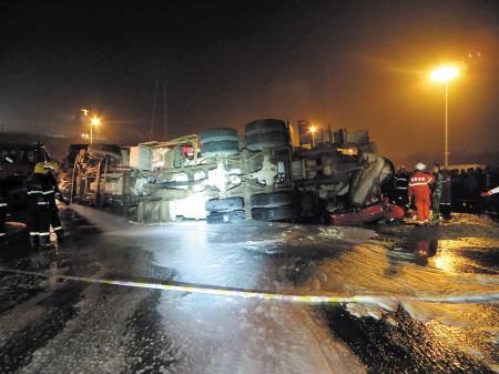 指揮員立即下達命令,由消防車在水泥罐車處架設一水槍陣地,對汽油進行引流沖散和泡沫覆蓋,防止二次事故的發生。